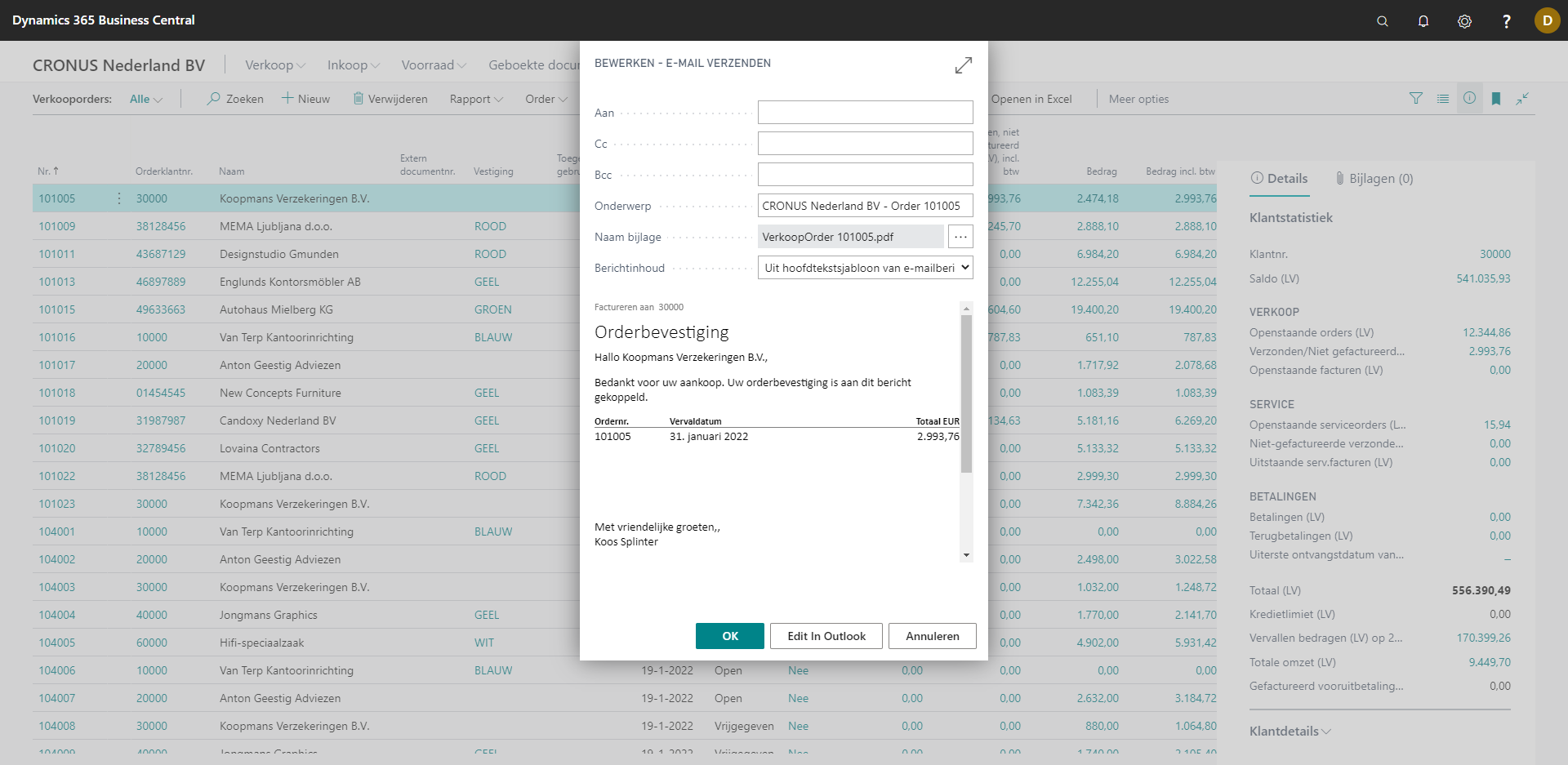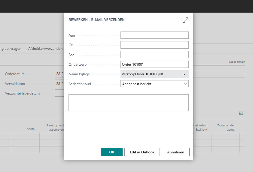 With Microsoft Dynamics 365 Business Central you can easily send documents as a PDF or as an electronic document via email to your customers, and create beautiful email templates in the style of your company. But with standard Business Central you can’t send them with Outlook without adding your e-mail address in Business Central. With Edit in Outlook you can. Send your sales & purchases quotes, orders, invoices and other documents with Outlook. Use the email templates from Business Central, and easily open and edit your outgoing emails within Outlook. After sending, the email is stored in your personal outbox in Outlook. Various documents such as orders and invoices can be sent directly from Business Central via e-mail as a PDF or as an electronic document.